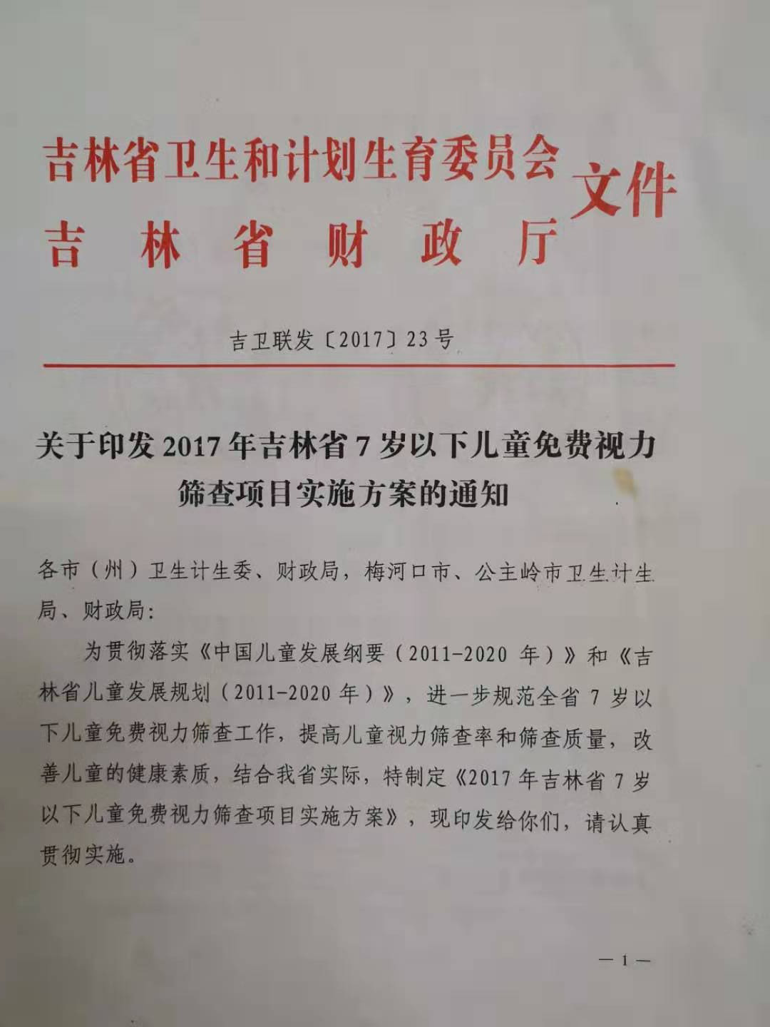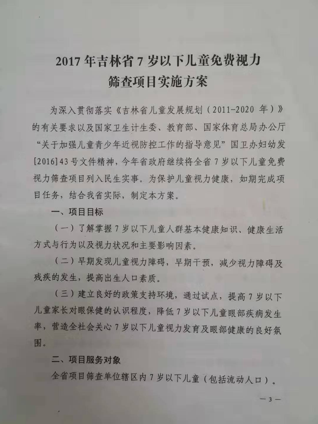 关于印发2017年吉林省7岁以下儿童免费视力筛查项目实施方案的通知